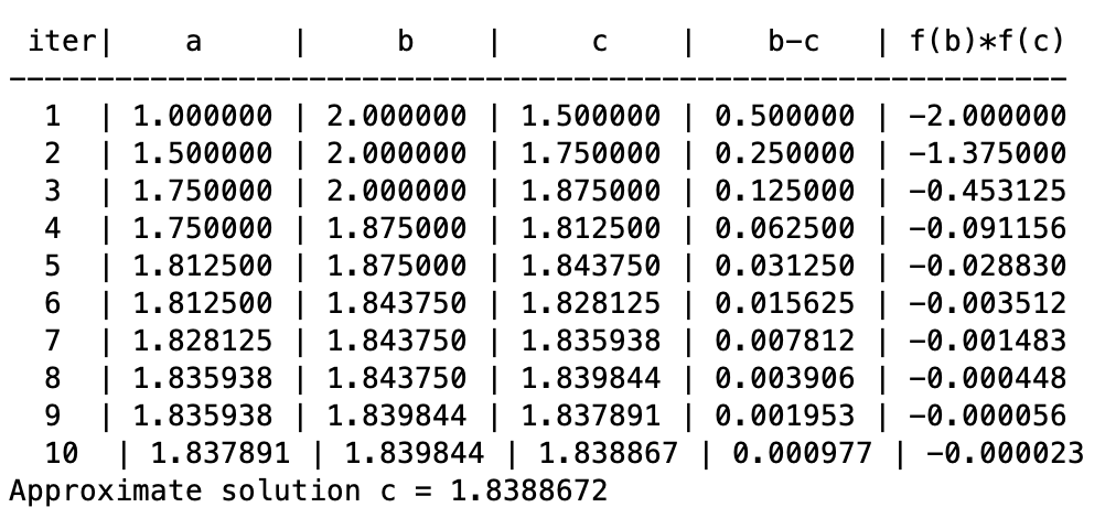 fprintf(1,' iter| a | b | c | b-c | f(b)*f(c)\n');